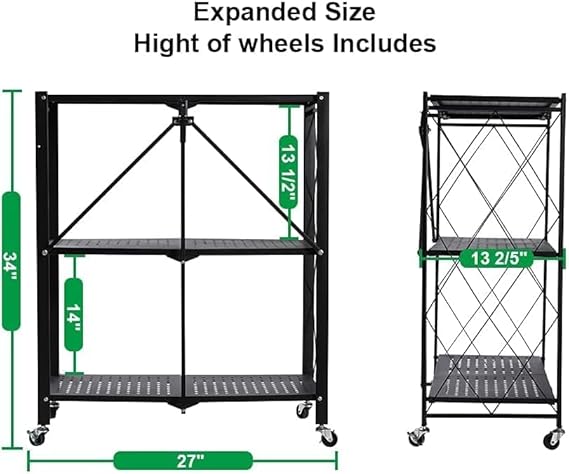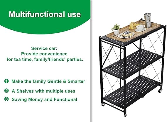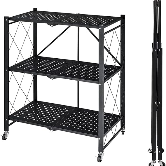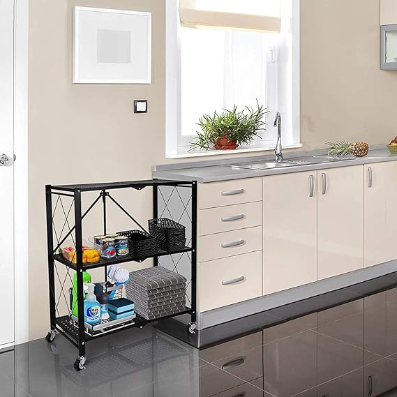 - Foldable Storage Shelves with Wheels, Black Metal Wire Rack, Easy Moving Shelf, Storage Organizer for Kitchen, Bathroom, Garage, Outdoor (3 Tier)