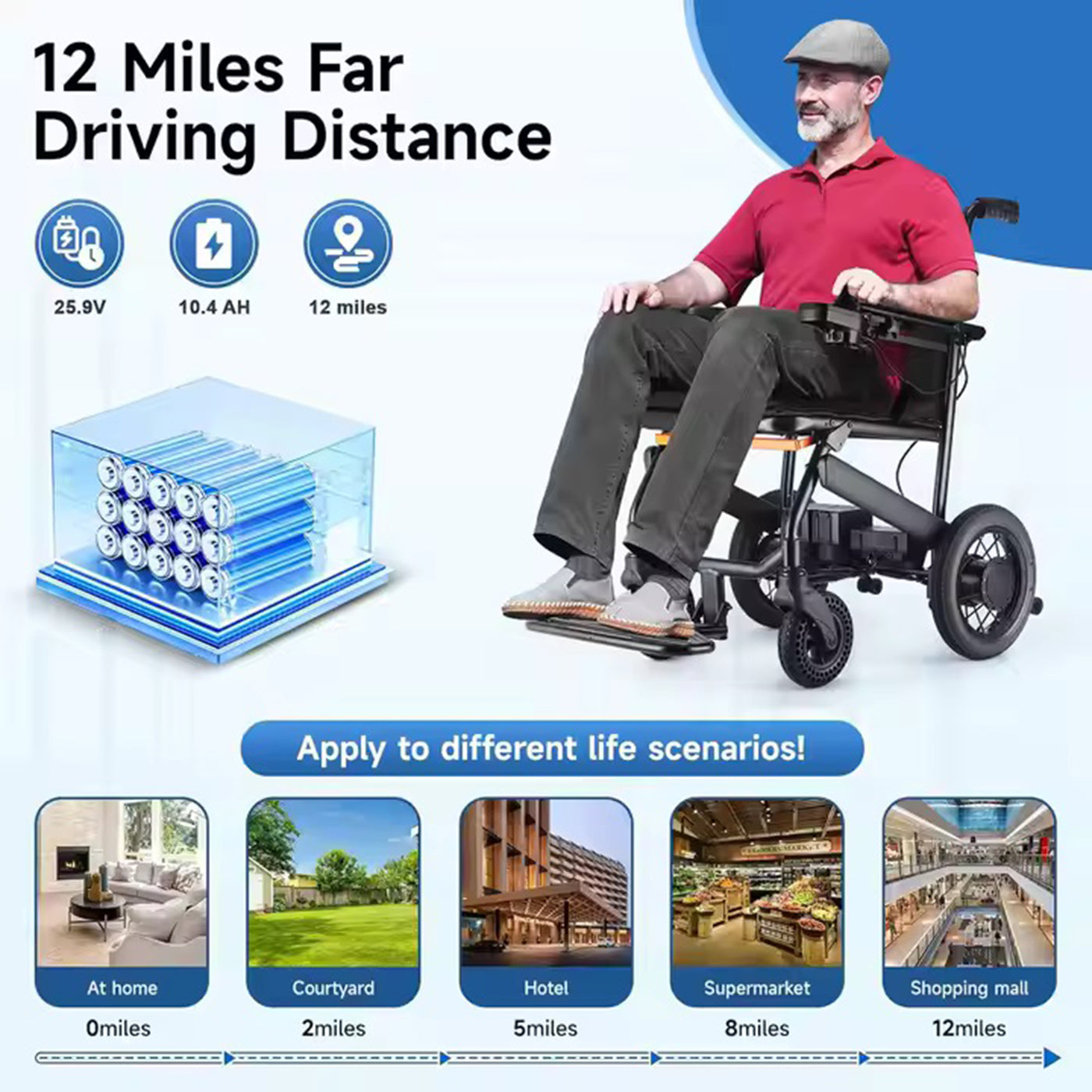 ✔️ [Removable Batteries for Travel Convenience]: Airline approved slide-out batteries under the seat can be quickly removed, reducing the wheelchair's weight further. It's a lithium-ion battery assembled with top-quality materials, ensuring safety and reliability.