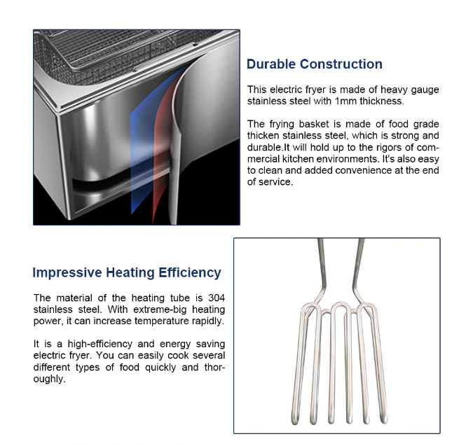 Heating Element: Designed for consistent heat distribution and fast recovery, ensuring even frying results.