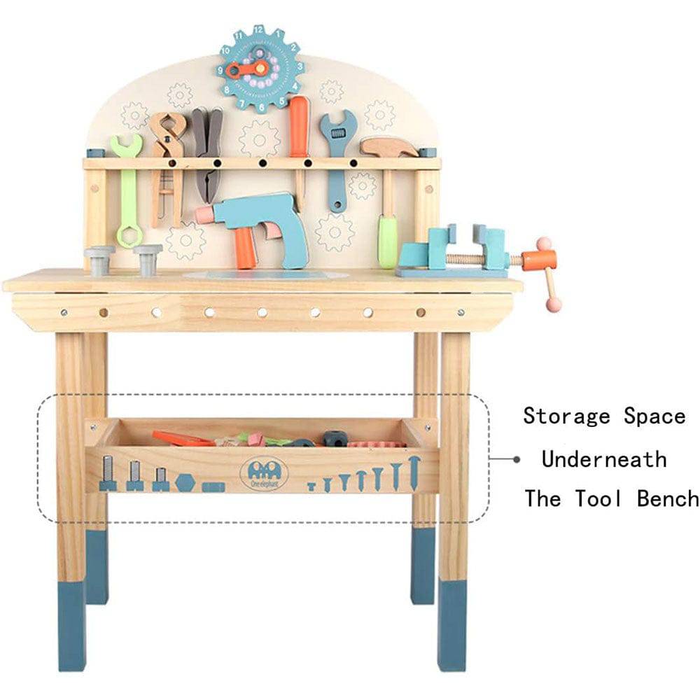 Convenient Storage: Features a storage compartment beneath the workbench to neatly store accessory pieces. Tools can be hung up for easy cleanup, making it a parent-friendly toy.