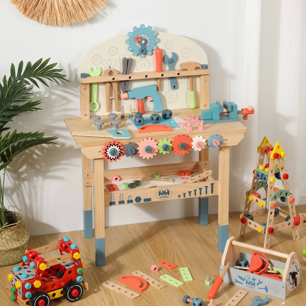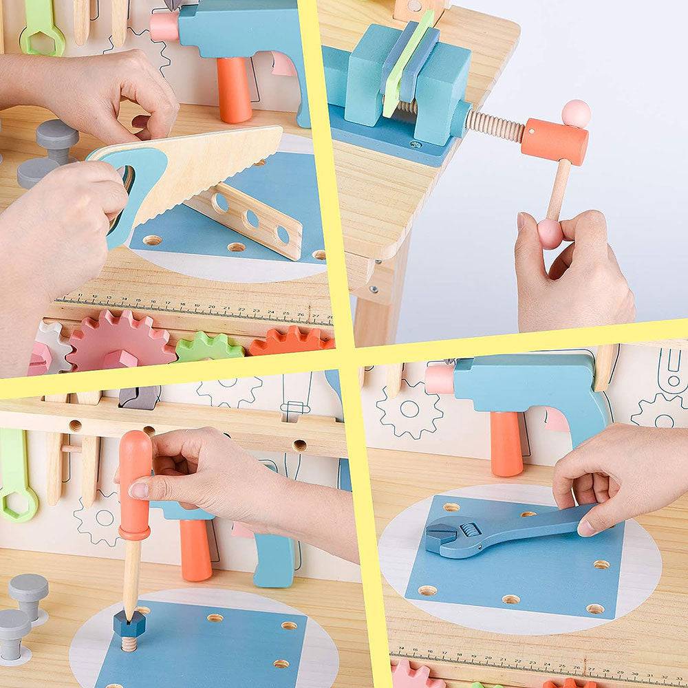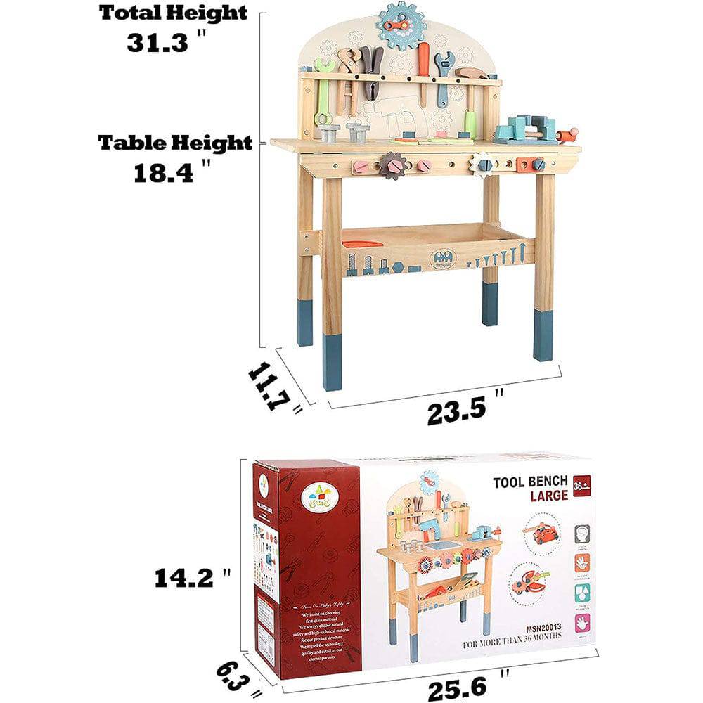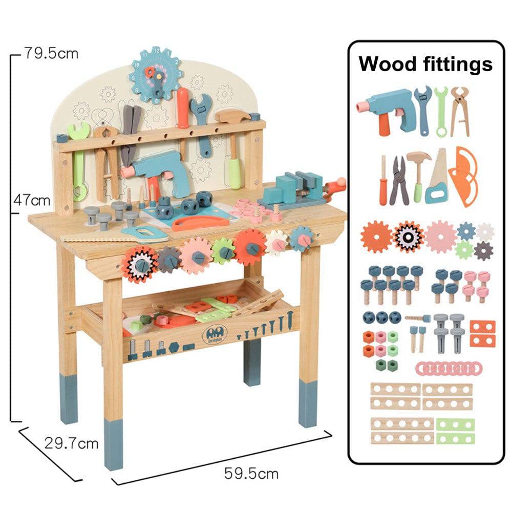 Endless Fun: A wooden workbench includes a hammer, saw, screwdriver, wrench, vise, screws, nuts, bolts, gears, and more creative parts for building. Provides hours of collaborative play, fostering motor skills and hand-eye coordination.