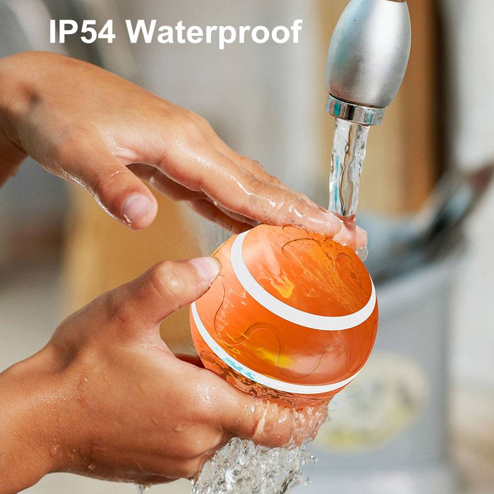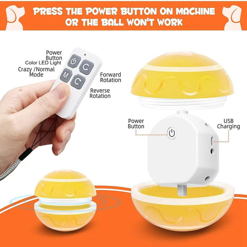 Active Attraction: A self-rolling ball moves autonomously, bounces, shakes for 10 seconds, rests, and then resumes after 2 minutes. RGB lights flash intermittently, capturing the dog's attention.