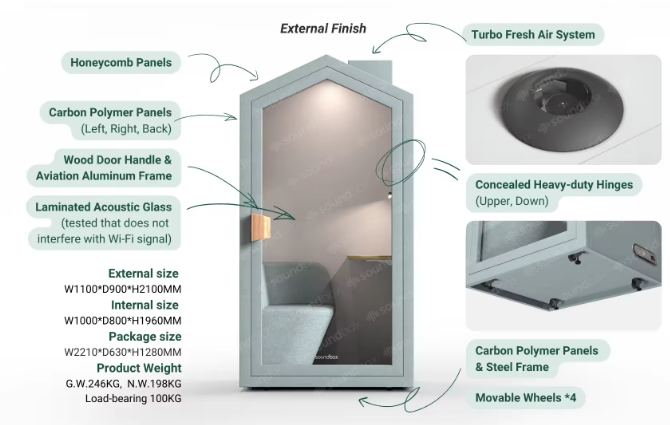 - Booth Material: Carbon plastic sound insulation board, PET acoustic board, polyester fiber acoustic cloth, aluminum profiles, 304 stainless steel, ABS engineering plastic.