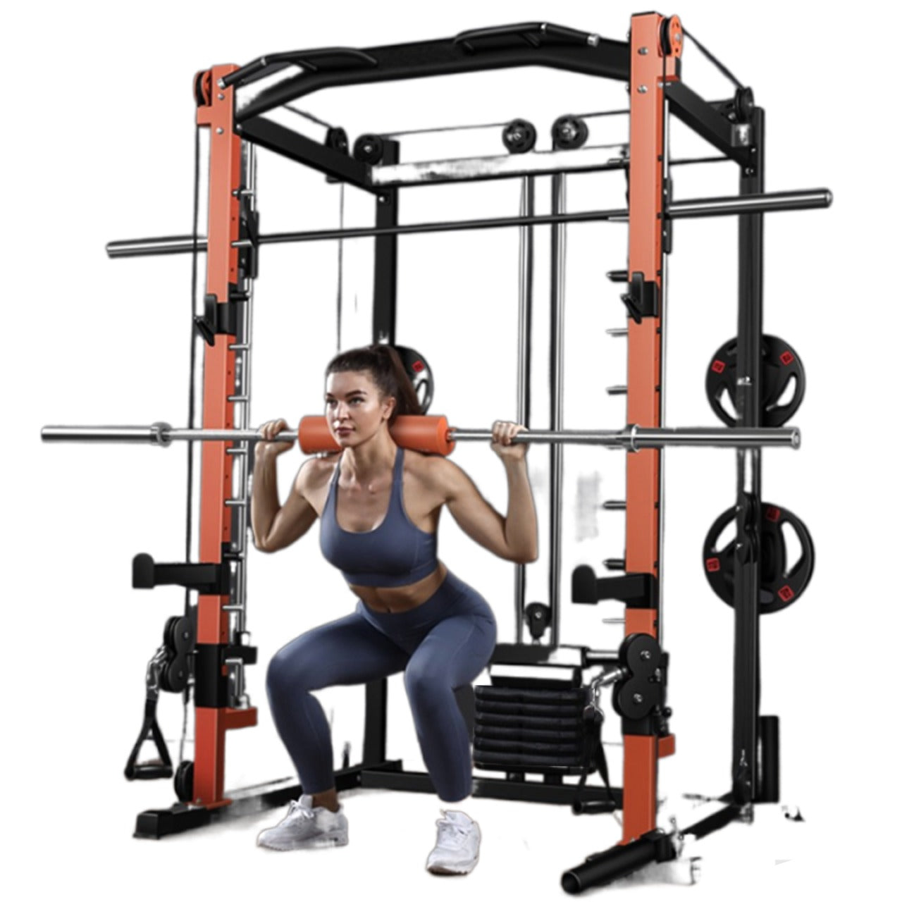 Versatile Squat Rack: Suitable for 7ft Olympic or standard barbells, equipped with adjustable J-Hooks and long Safety Bars for secure barbell exercises.