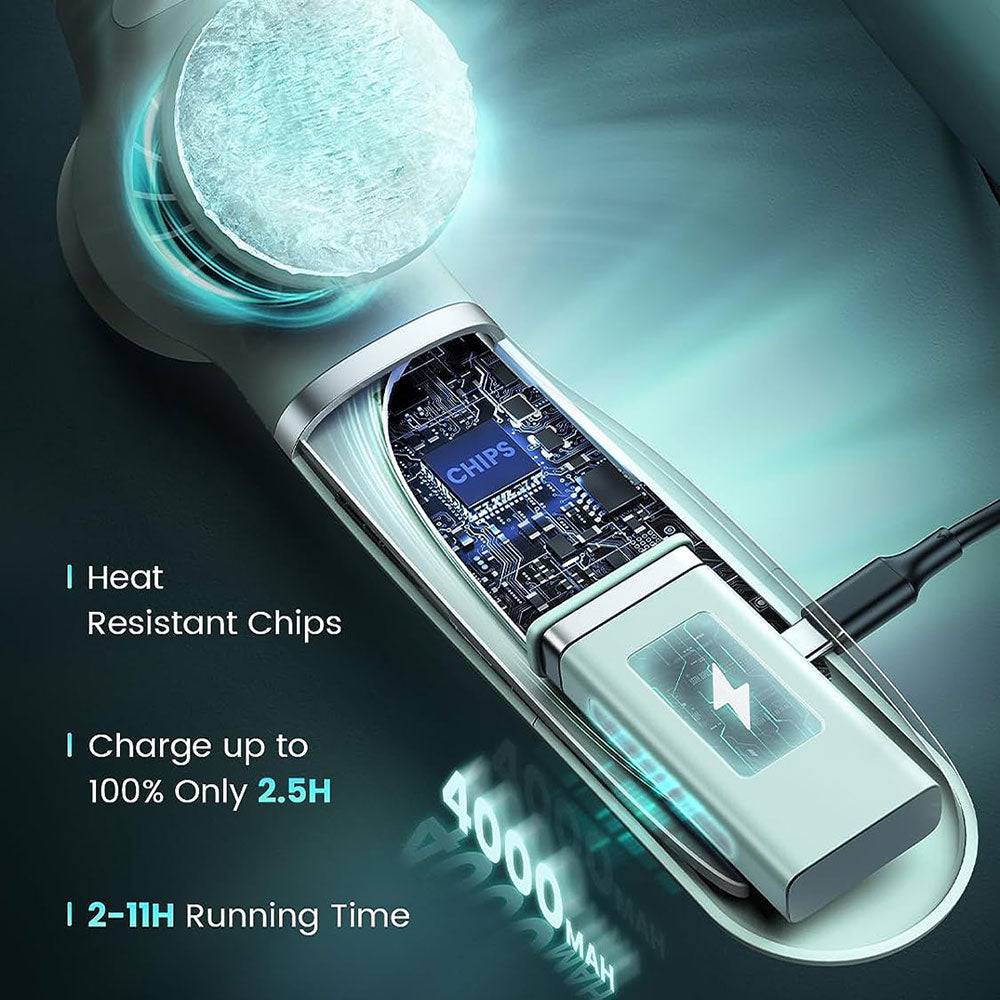 USB Rechargeable: 4000 mAh rechargeable battery lasts 1.5–10 hours, depending on speed; can be used while charging.