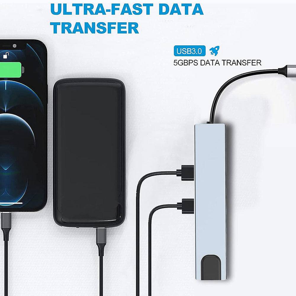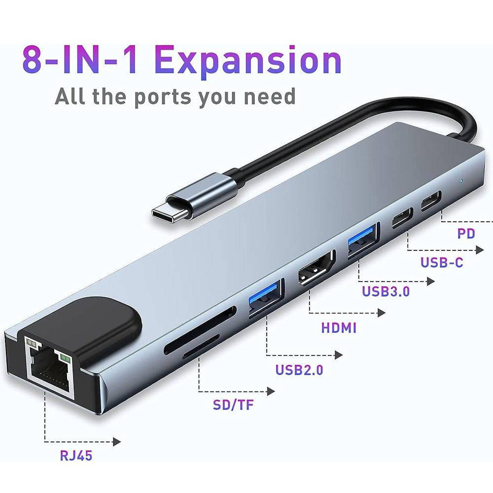 Versatile 8-in-1 Hub: Features USB 3.0 port, USB 2.0 port, USB C port, PD port, 4K HDMI video output, RJ45 100M Ethernet interface, and SD/Micro SD card reader slots.