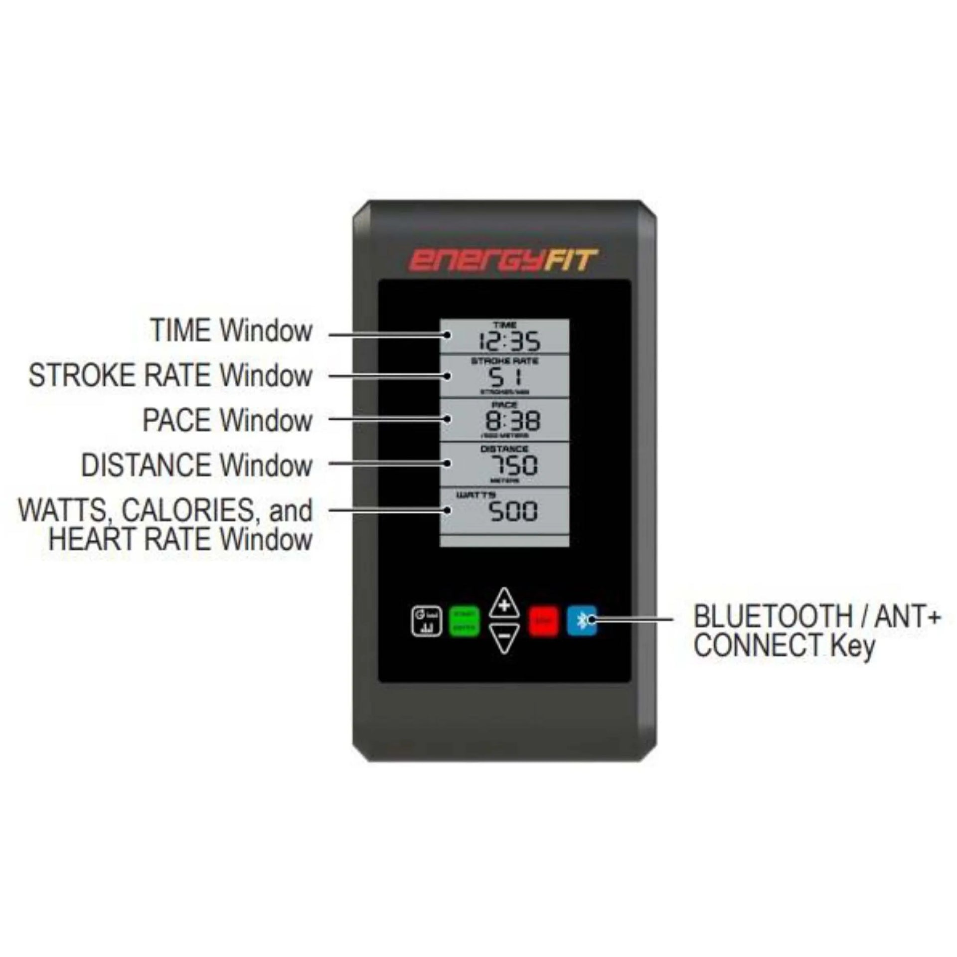 - Console Display: Monochrome LCD display (3.7in x 2.2in) showing time, pace, stroke rate, distance, calories, watts, and heart rate.