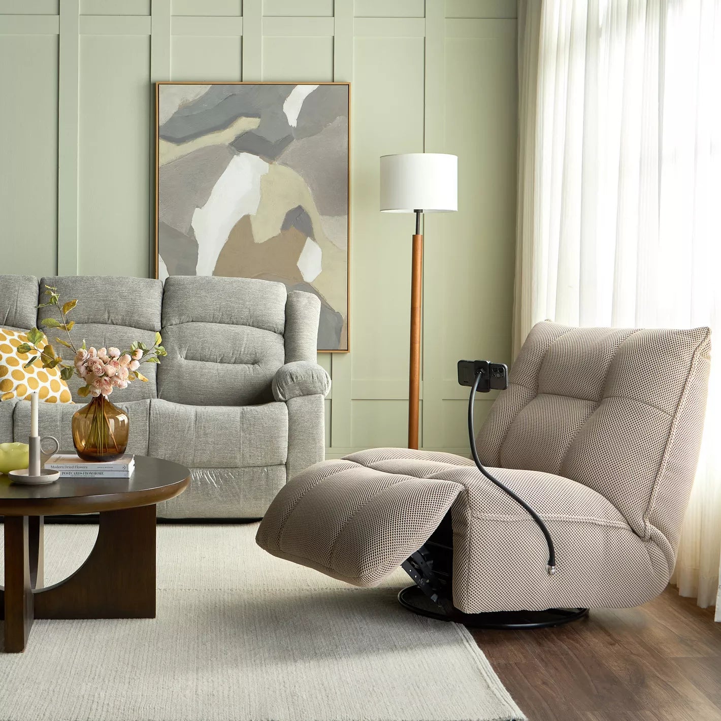 - Sloped arm style enhances comfort and modern appeal.