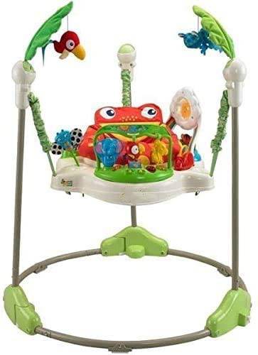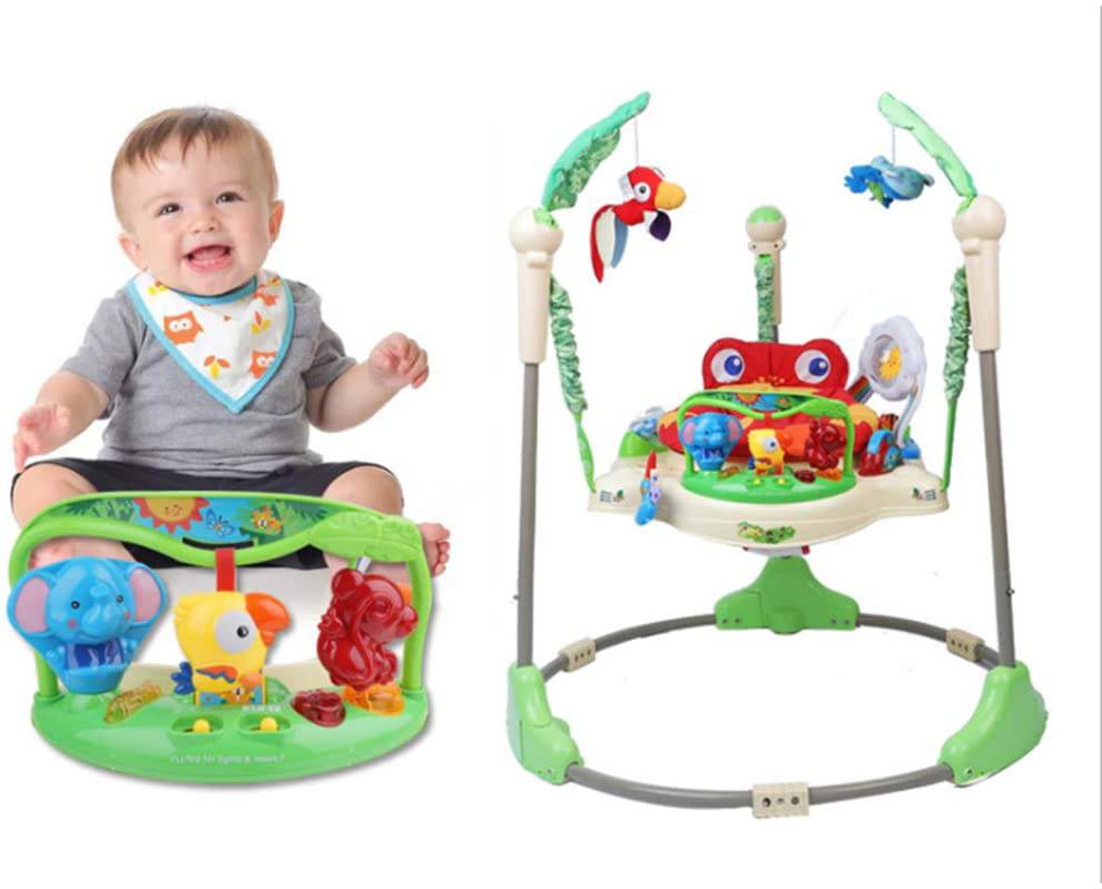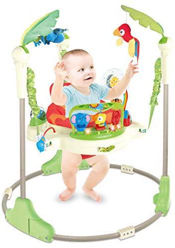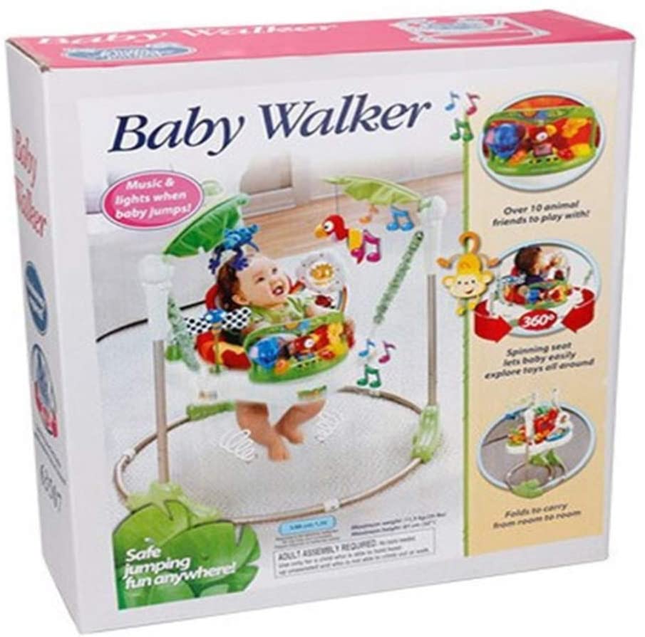 - A fun seat and toys at five locations on the platform engage baby all the way around, and an electronic toy at the front has motion, music and lights that can be activated by baby spinning a drum