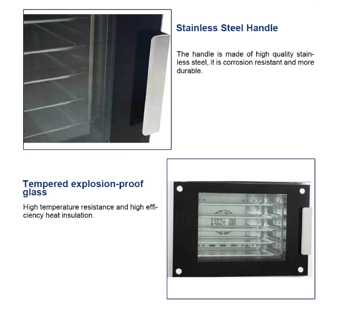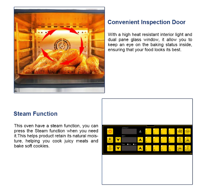 - Steam Injection: Steam function enhances baking quality, particularly for bread and pastry, by adding moisture to the baking environment.