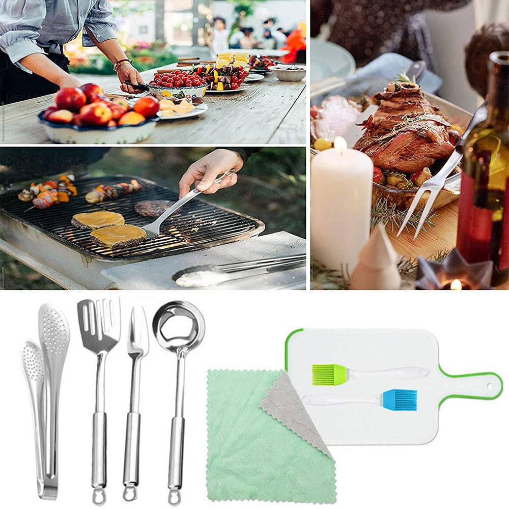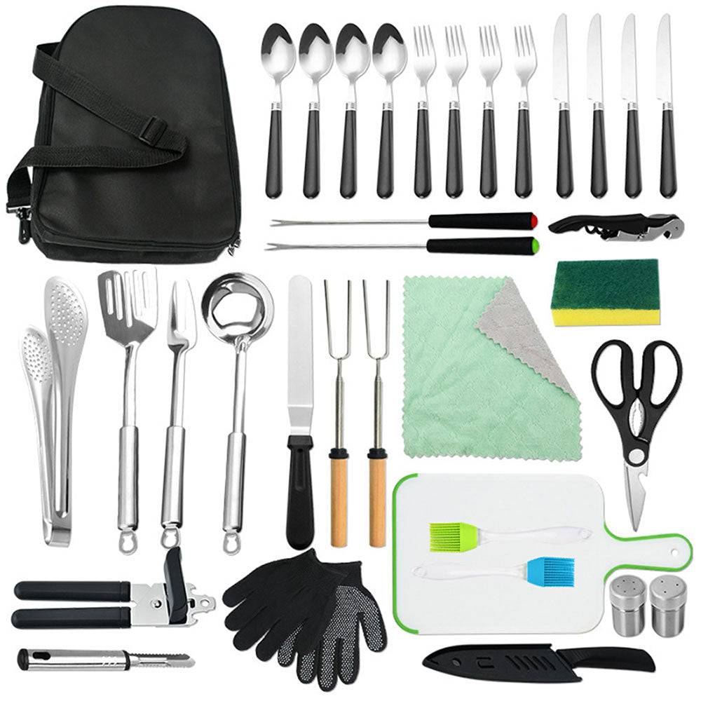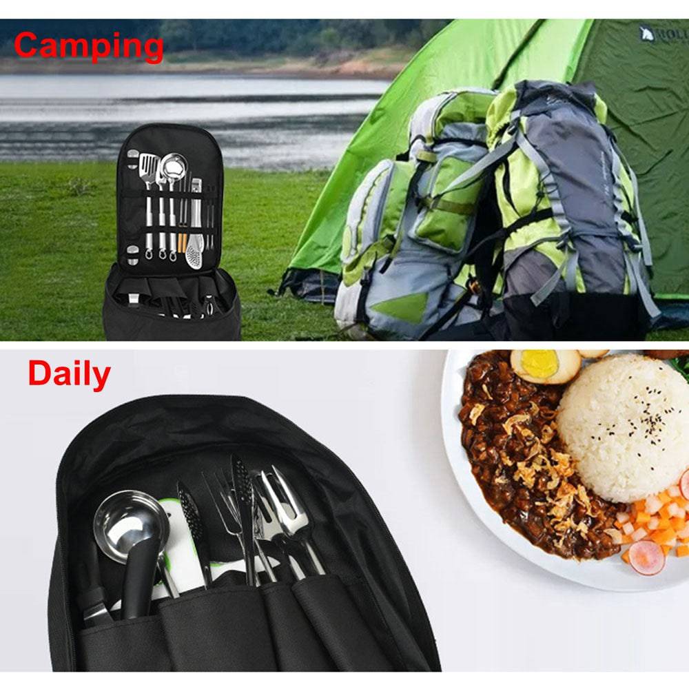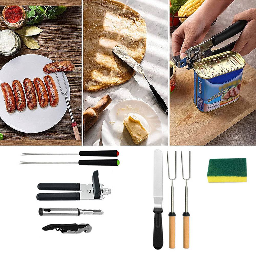 - Robust cookware made for the outdoors, When outside of your home’s comfort zone, you need camping accessories you can count on. Our outdoor cooking kit features cutlery 100% made with high-end stainless steel for enhanced durability & reliability. Our utensils are also dishwasher-safe and are made to withstand years of constant use.