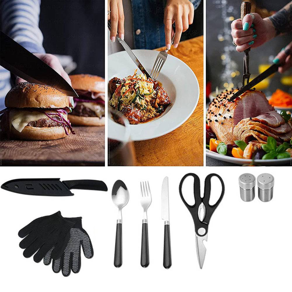 - 34 Piece Cookware Kit: Spoon *4, fork *4, knife *4, baking fork *2, retractable baking fork *2, corer *1, rag *1, sponge *1, multi-functional scissors *1, heat-proof hand socks *1, seahorse knife *1, cutting board *1, stainless steel seasoning bottle *2, multi-functional can opener *1, silicone brush *2, kitchen knife *1, food clip *1, spatula *1, stainless steel fork *1, Stainless steel shovel *1, stainless steel spoon *1(Storage Bag*1)