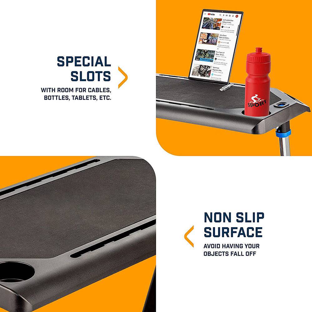 Non-Slip Surface: Features a non-slip surface with built-in tablet and cellphone slots, providing a secure space for gadgets and essentials.