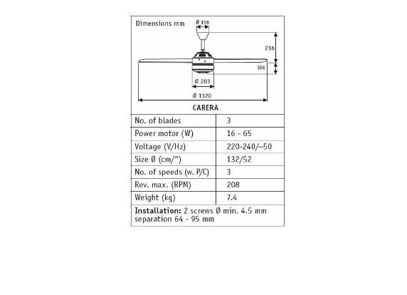 - Ceiling Height: 216 mm separation between ceiling and blades