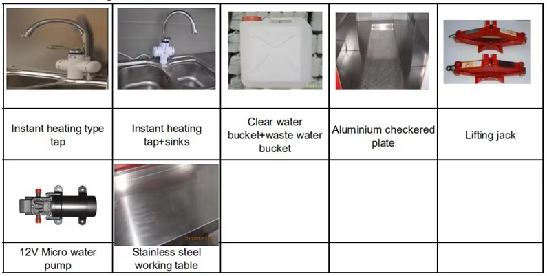 - Freshwater tank, wastewater tank, 12V mini water pump, and control switch.