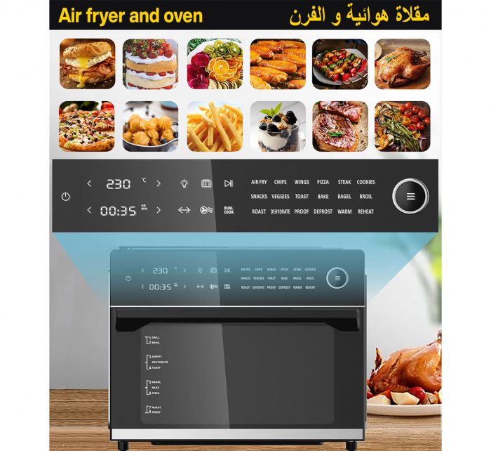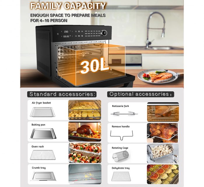 - Accessories Included: Air fryer basket, baking pan, oven rack, crumb tray, rotisserie fork, remove handle, rotating cage, and dehydrate tray.