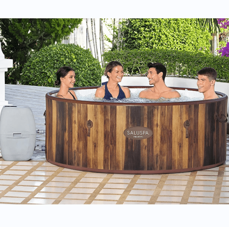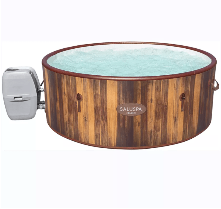 - Portable, stylish, and compact: with lift handles, the spa can be moved around with ease. This spa deflates compactly for optimal storage and transportation purposes. With a wood paneling design, the Helsinki spa adds a nice touch to your deck and outdoor décor.
