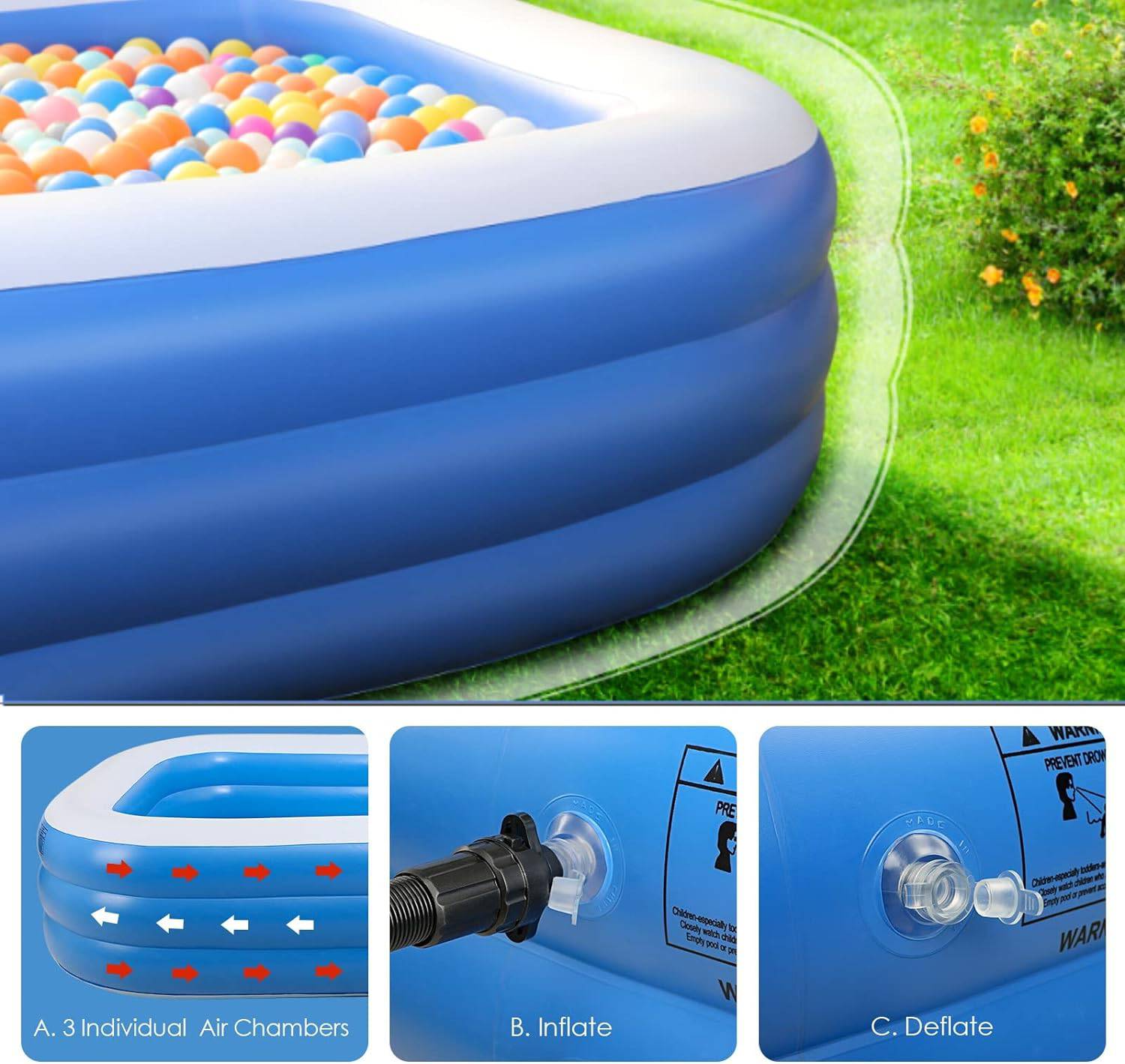 Quick Setup and Deflation: Three separate chambers with dual inlet and outlet, along with free-flow exhaust valves, enable easy and safe inflation and deflation. Electric pump (not included) inflates the pool in just 3-4 minutes. The 90° vertical drain pipe and curved water valves ensure swift drainage.