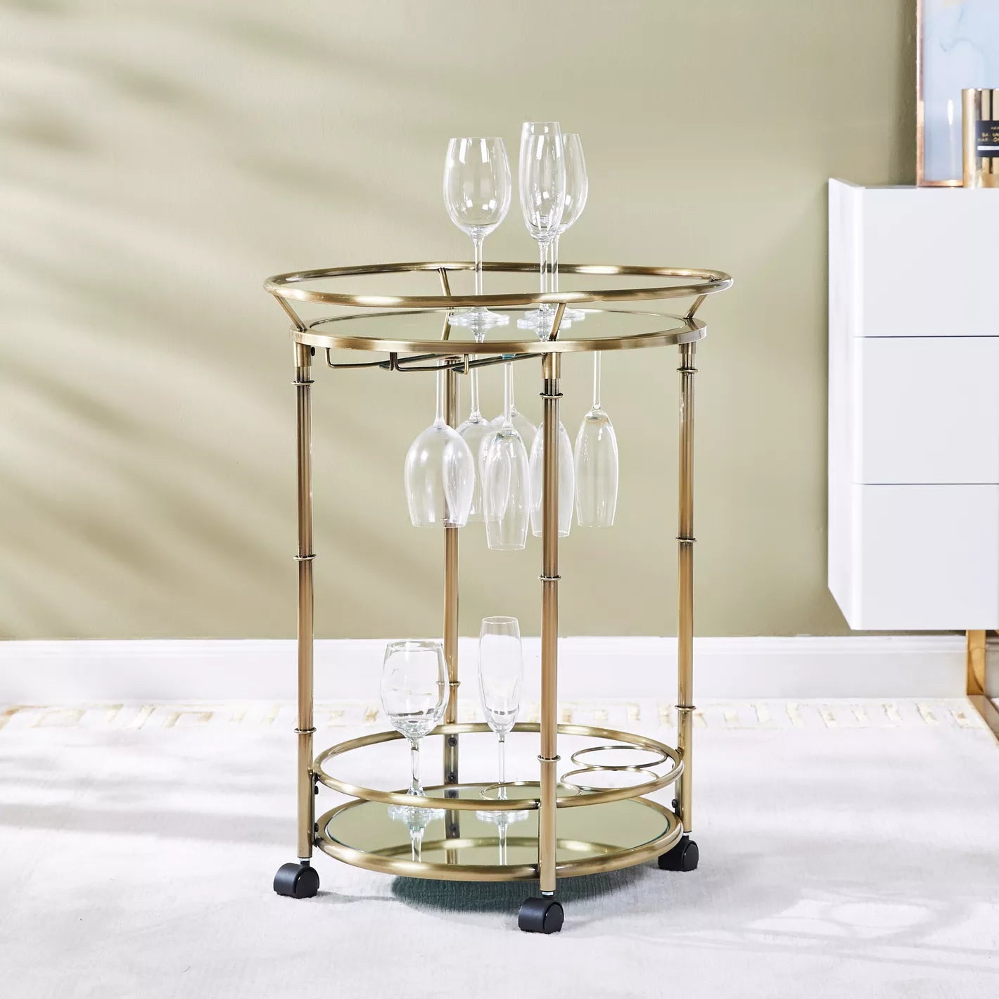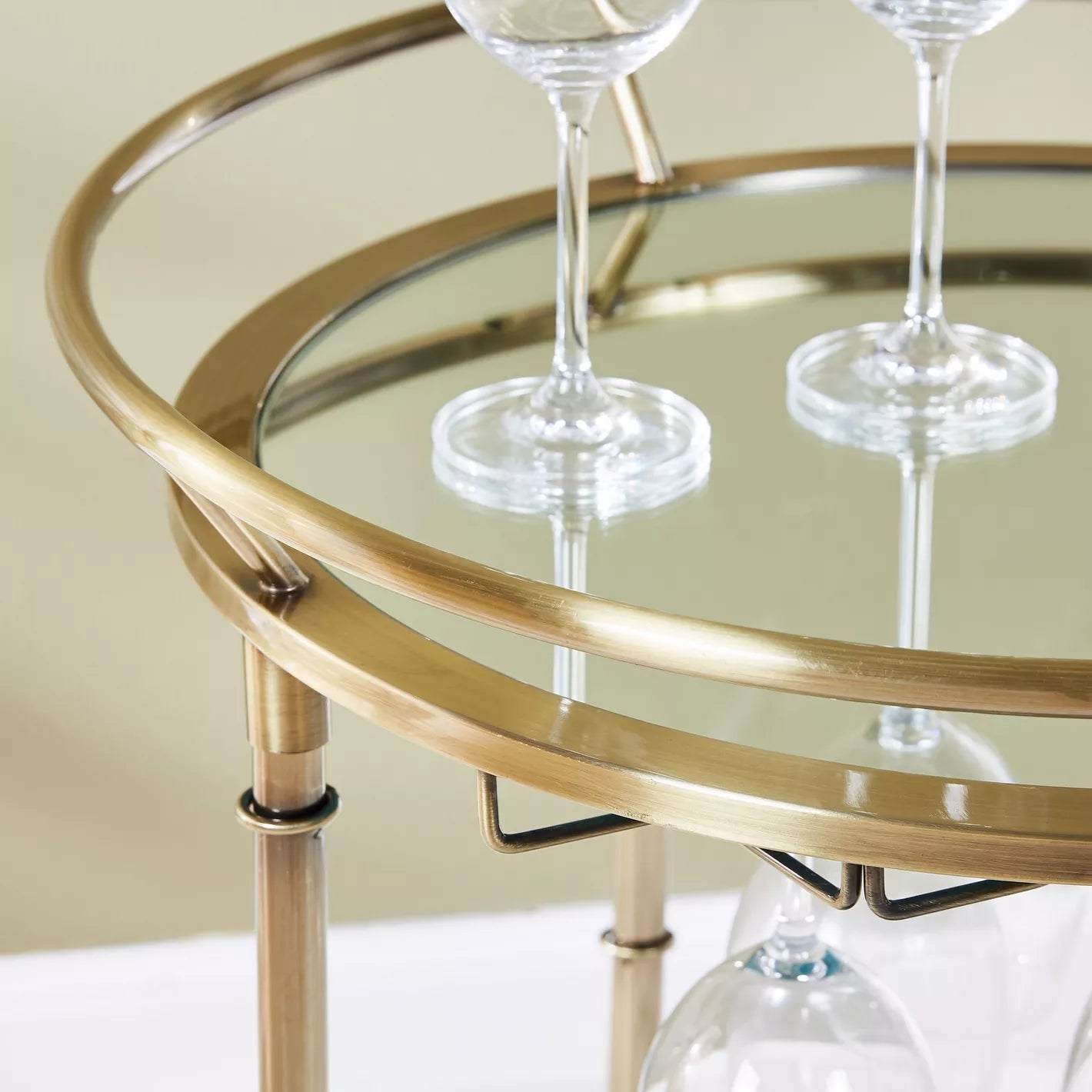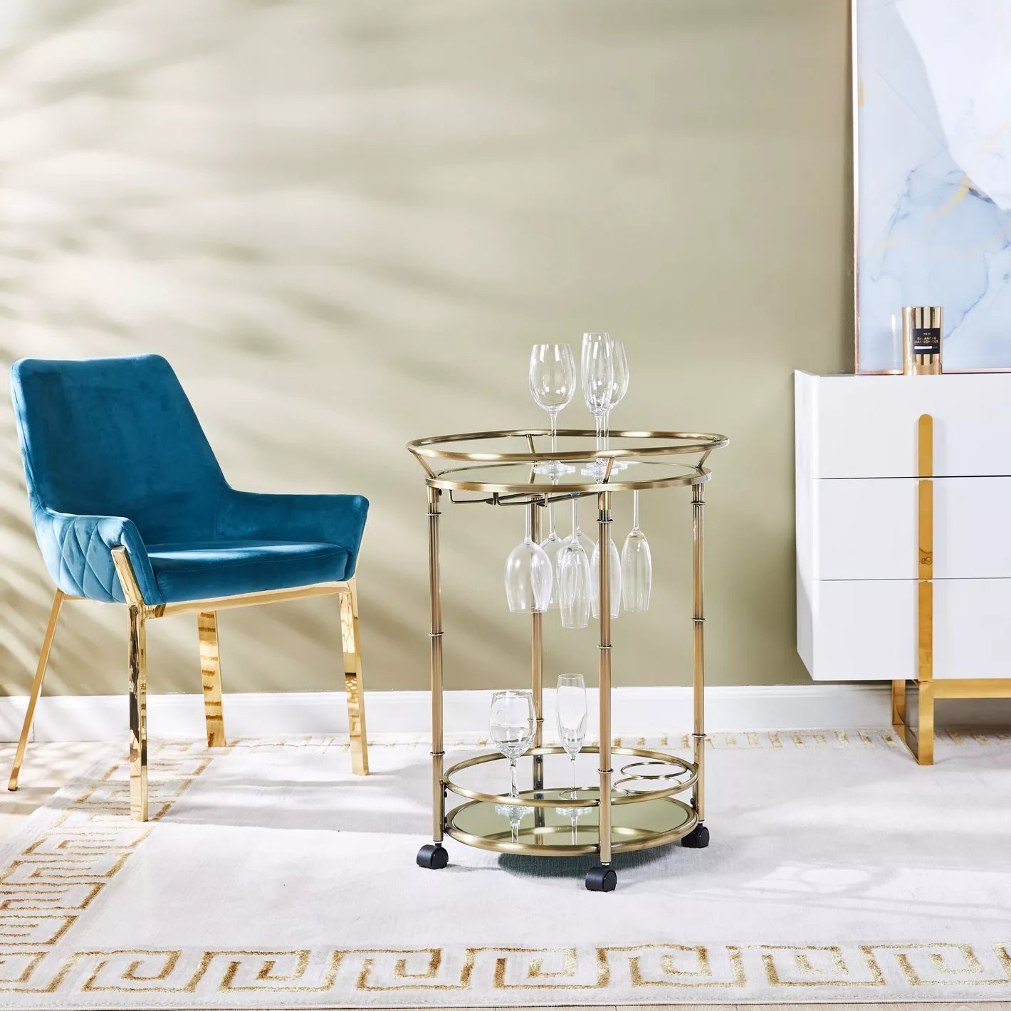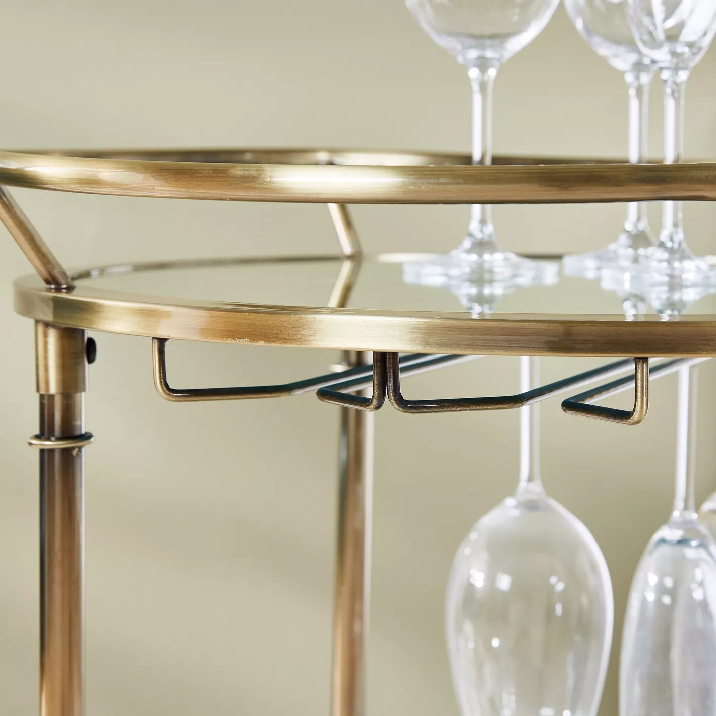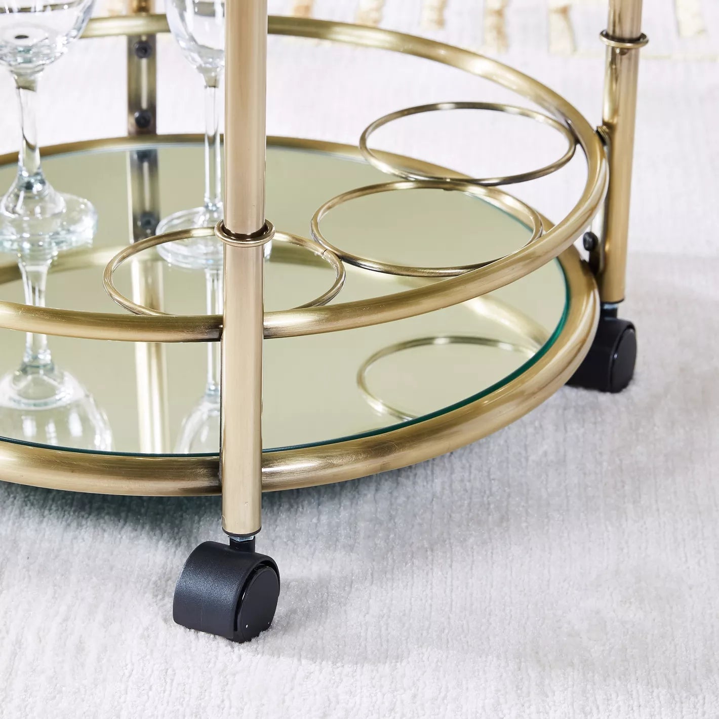 - Design: Modern luxe round trolley with two tiers, ideal for storing bottles and glasses