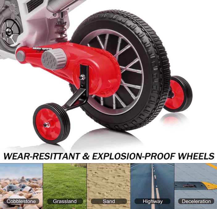 Supportive Design: Comes with 2 training wheels to assist young riders in maintaining balance, especially over bumps.