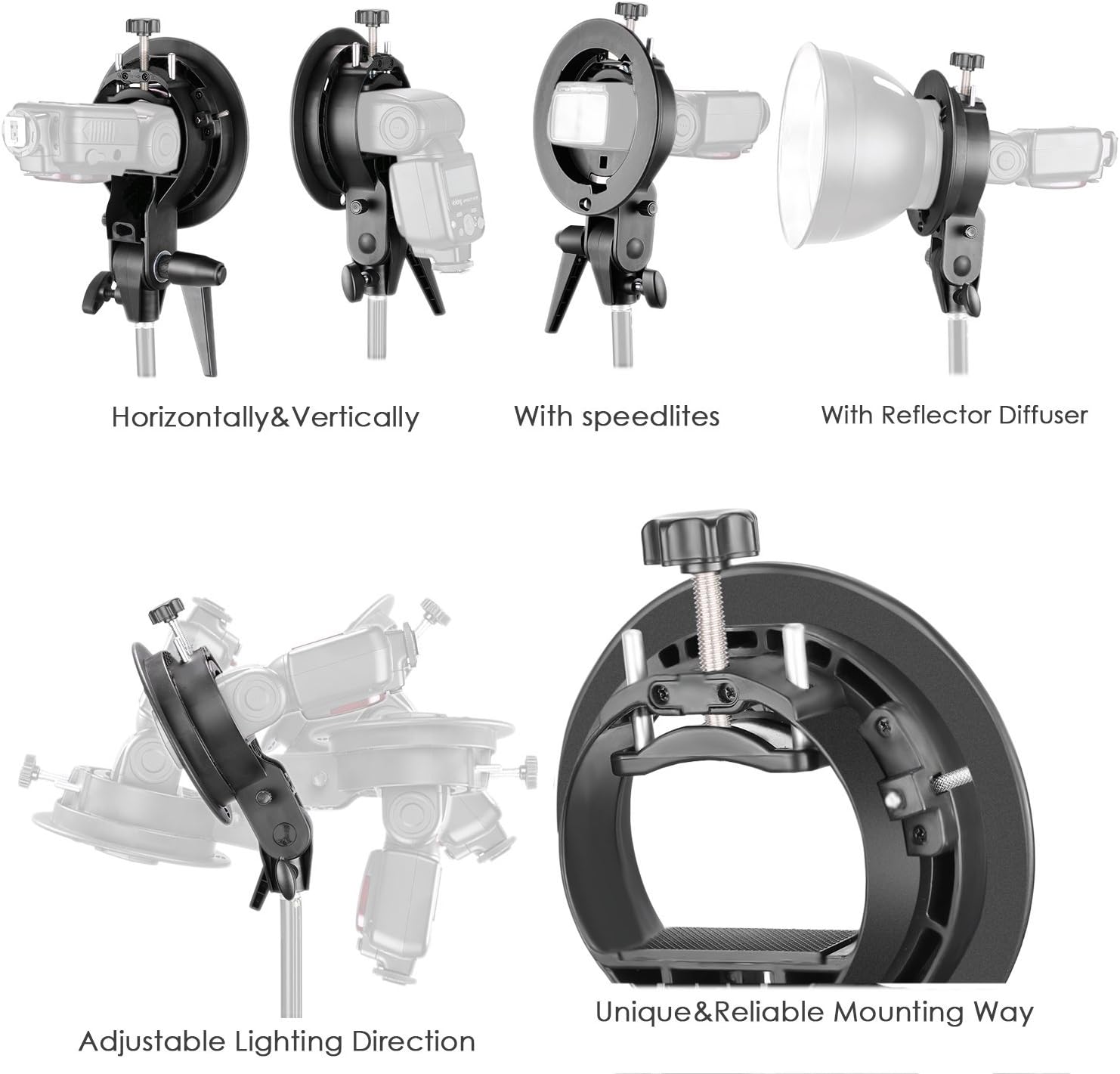 - The unique clamp design ensures a secure grip on the speedlite, both horizontally and vertically.