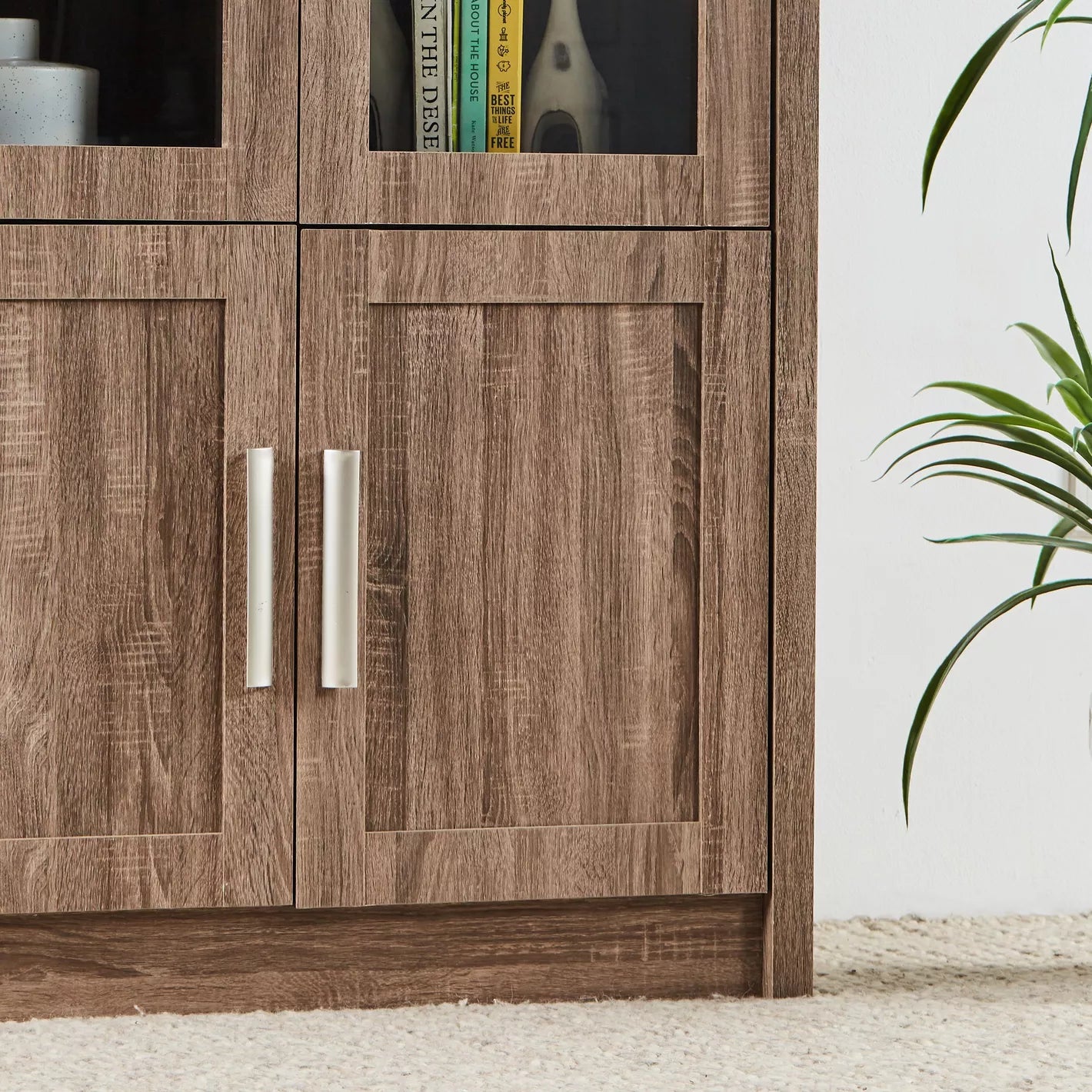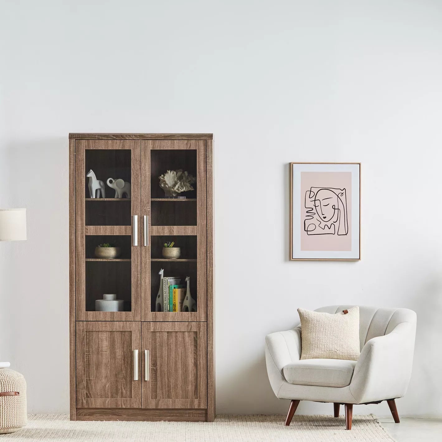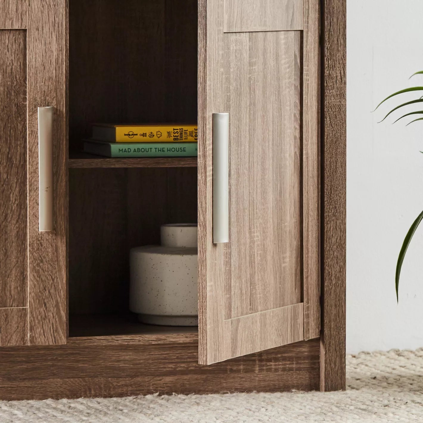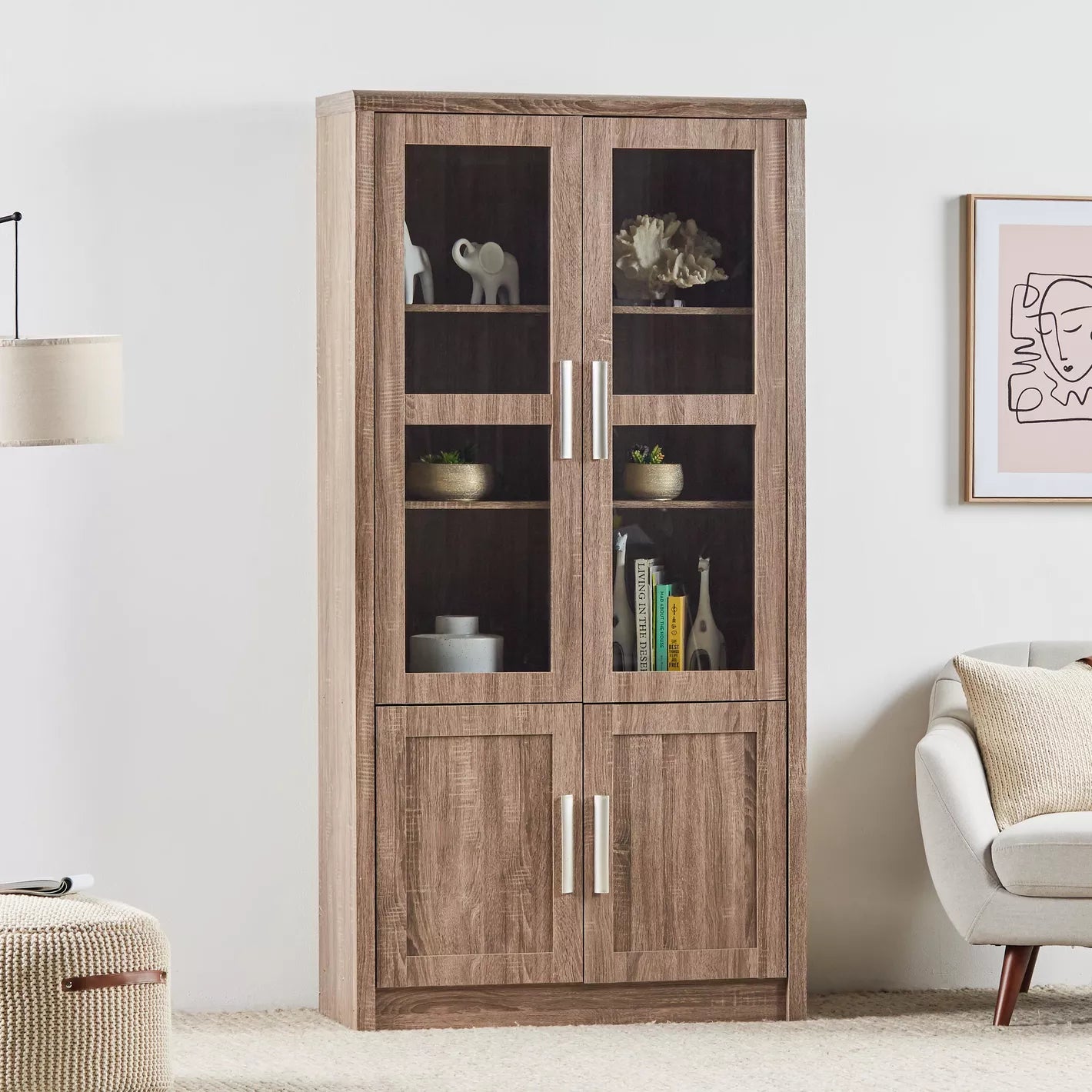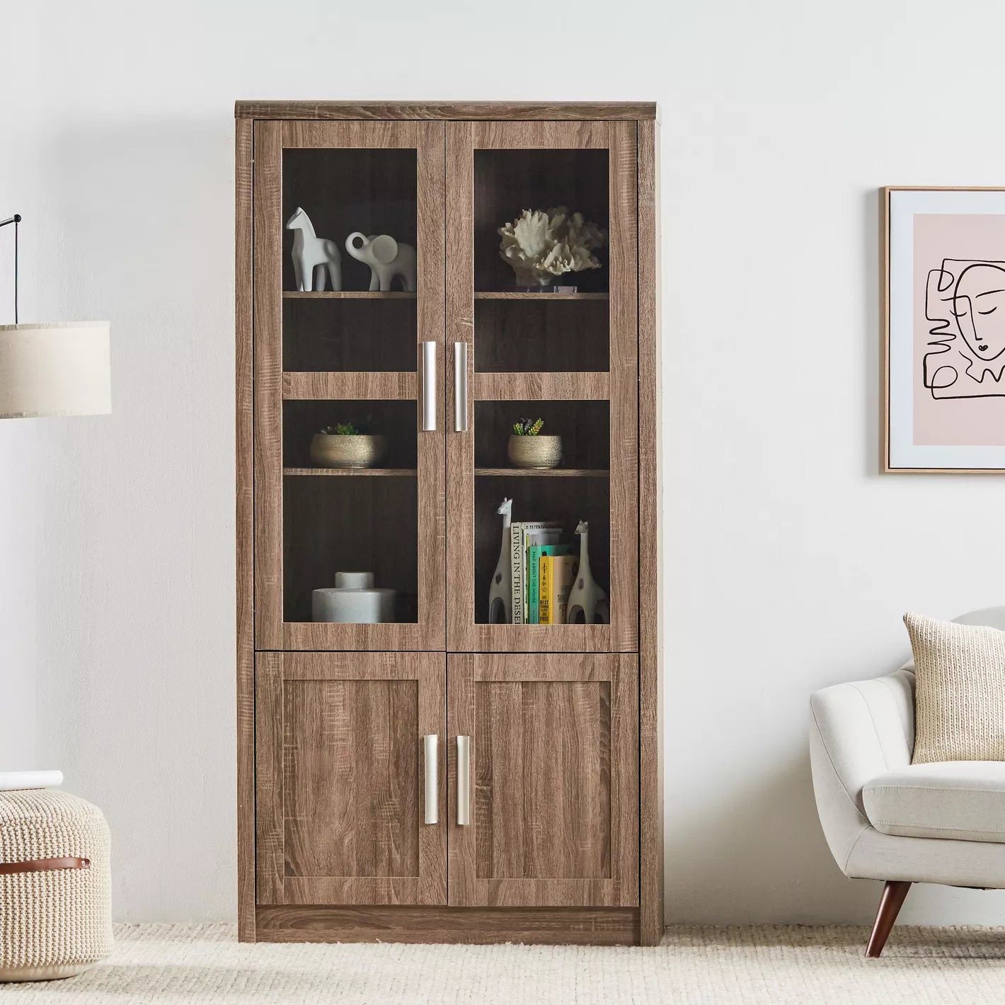 - Storage Options: Includes four doors for concealed storage, complementing the open shelves.