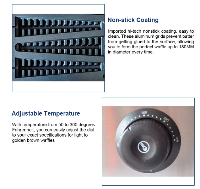 Adjustable Temperature Control: Allows for precise temperature adjustments to achieve the desired waffle texture and color.