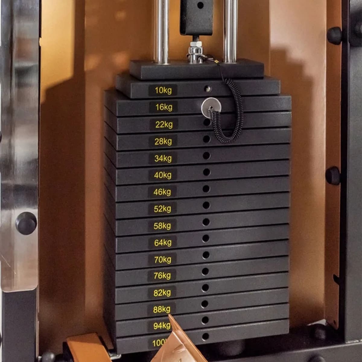 - Weight Stacks: Comes with two precision-cut steel 100kg pin select weight stacks.