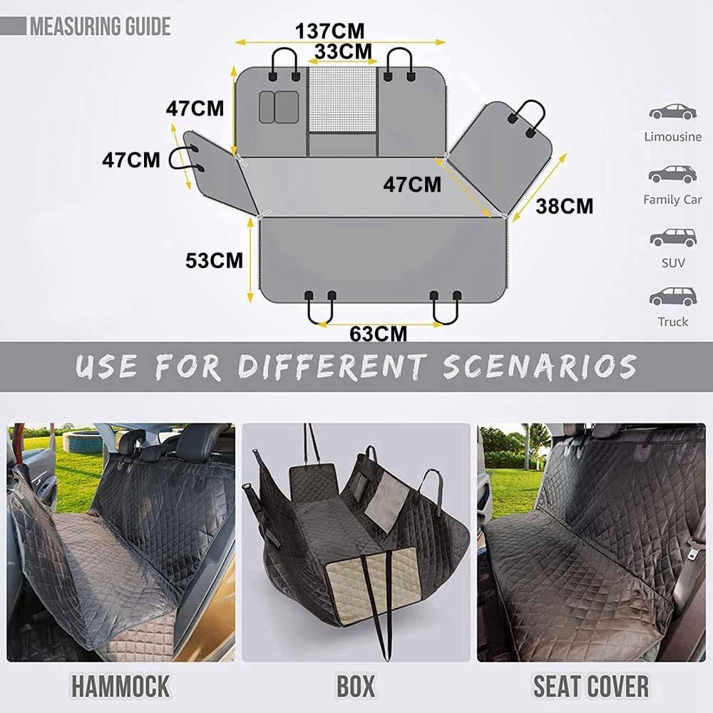 Generous Size: With dimensions of (137CM*147CM), this dog car seat cover fits various vehicles, such as cars, trucks, and SUVs. It provides full protection for your back seat, keeping it free from dirt and pet hair.