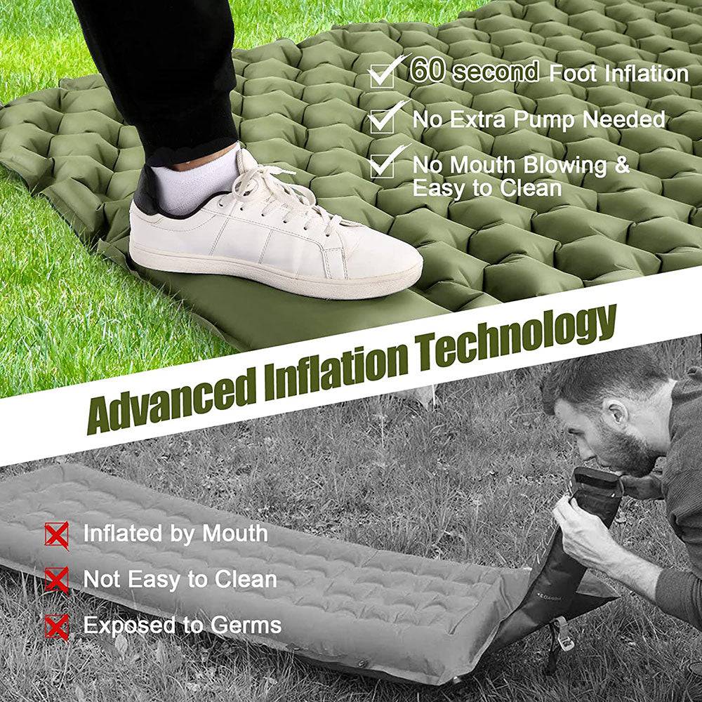 - 【EASY TO INFLATE & DEFLATE FAST】- Built-in foot pump, only need to stamp for 1 minute to fully inflate, no need to use the mouth or carry a heavy air pump, even kids can easily complete the inflation. The inflation valve and the deflation valve are independent, and the double-layer valves effectively prevent air leakage and achieve rapid deflation.