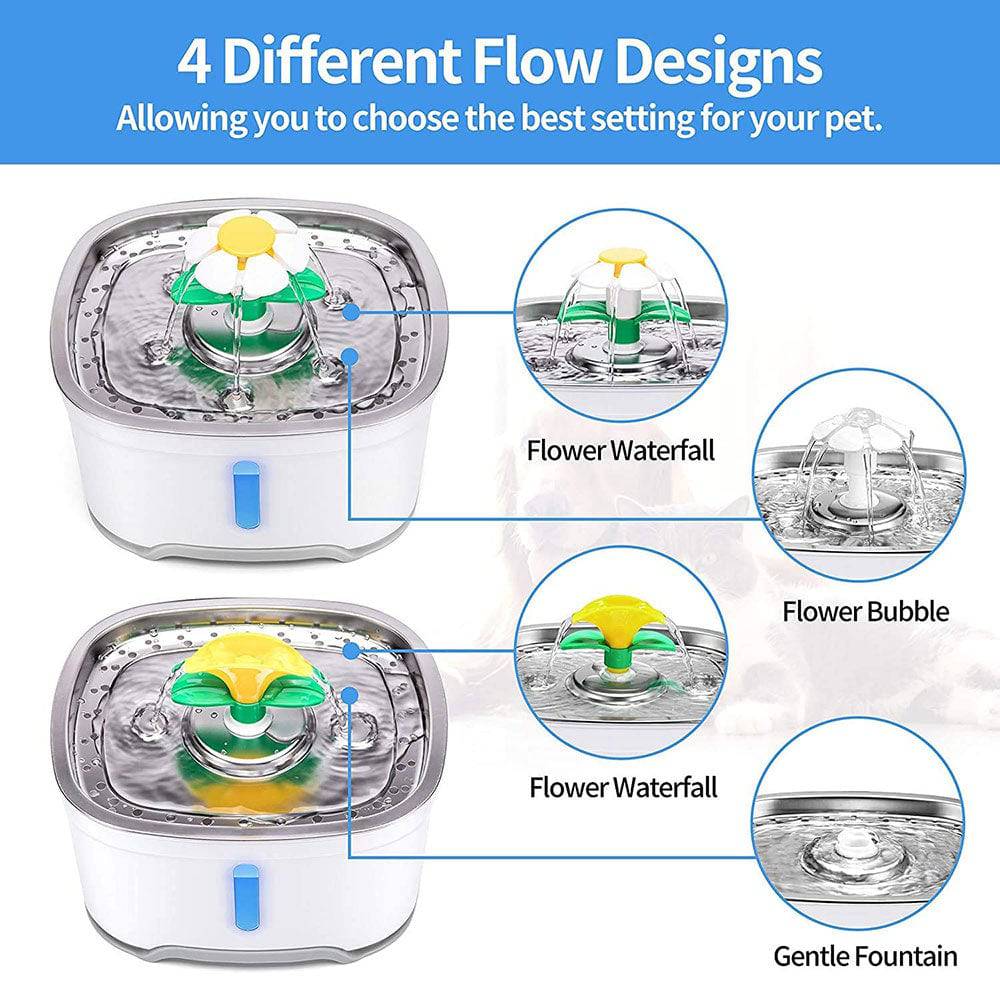 Versatile Water Flow Options: Two replaceable flowers and four flow designs offer customization, including flower waterfalls, bubbles, and a gentle fountain mode to suit your pet's preferences.