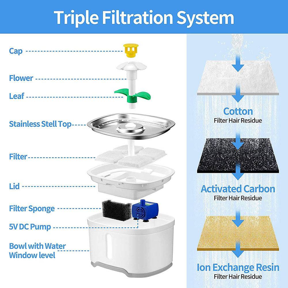 Generous Capacity with Filtration: Boasting a 2.5L super capacity, the fountain includes a filter and filter sponge as part of its triple filtration system, ensuring clean and fresh water for your pets throughout the day.