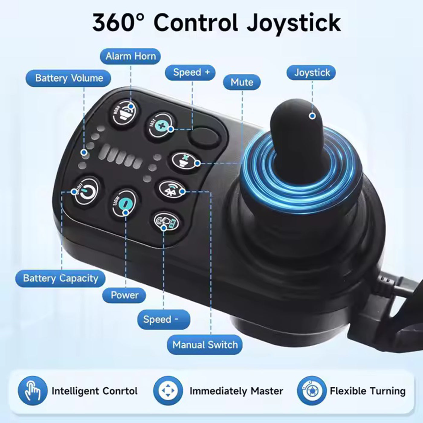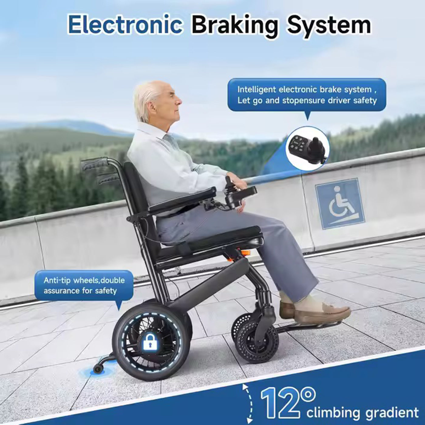 ✔️ [Intelligent Braking System]: Featuring an intelligent Electromagnetic Brake system, this wheelchair automatically applies brakes when your hands are off the joystick, whether on an incline, decline, or flat surface, ensuring safety and peace of mind.