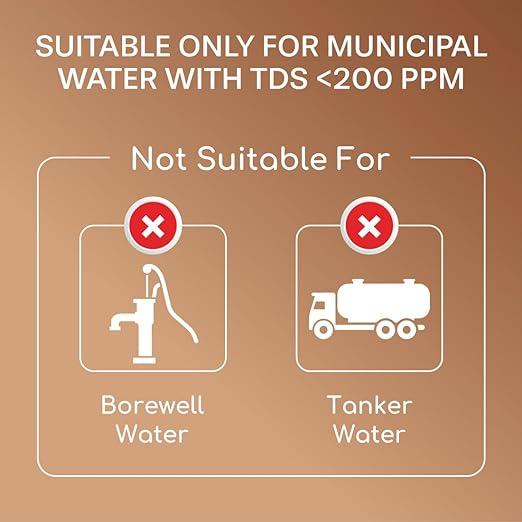 - Water Suitability- This product is ONLY SUITABLE for municipal/ public supply/ piped water. This water is NOT SUITABLE for tanker/ borewell water). This purifier can be used for TDS up to 200 PPM (use a TDS meter to find out the correct TDS of your water source before buying a water purifier)