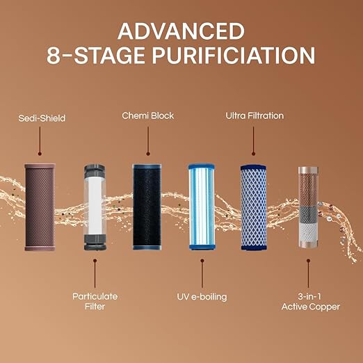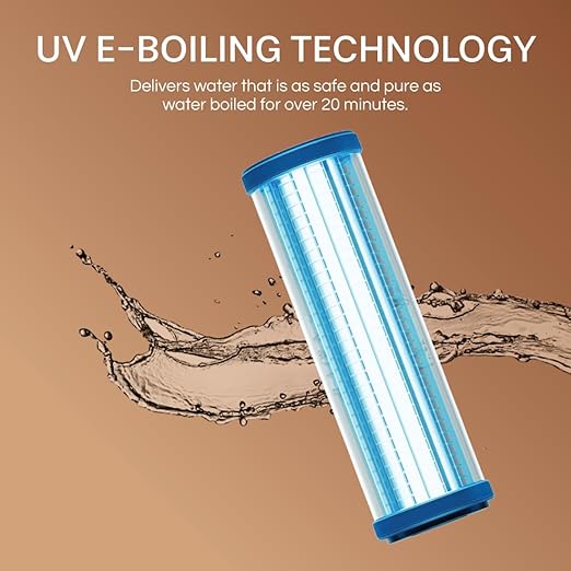 - Product Technology- UV+UF with 6 stages of purification. UV e-boiling delivers water that is as safe and pure as water boiled for over 20 minutes. Ultra Filtration imparts crystal clear clarity to drinking water in addition to making it safe from viral and bacterial contamination
